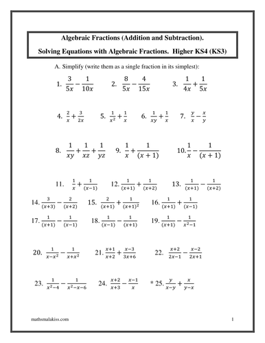 This collection of worksheets provides students with the opportunity to be introduced to algebraic fractions and how to solve them.