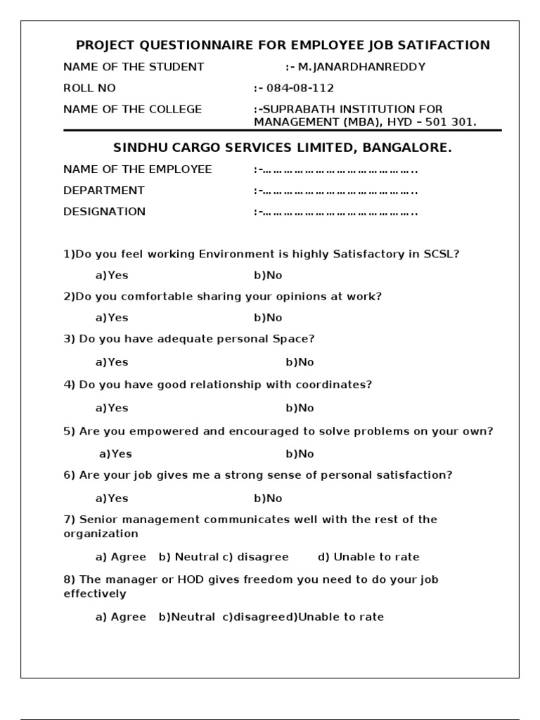Questionnaire on Job Satisfaction. (Please circle one number for each statement) DisagreeDisagree Agree Agree StronglySomewhatNeutralSomewhatStrongly If I do good work I can Documents Similar To Employee Satisfaction Survey Sample Questionnaire. The questionnaire, thereafter, will have questions to gauge the. For example, if patients want quicker access to the doctor, you can redesign your work schedule to.